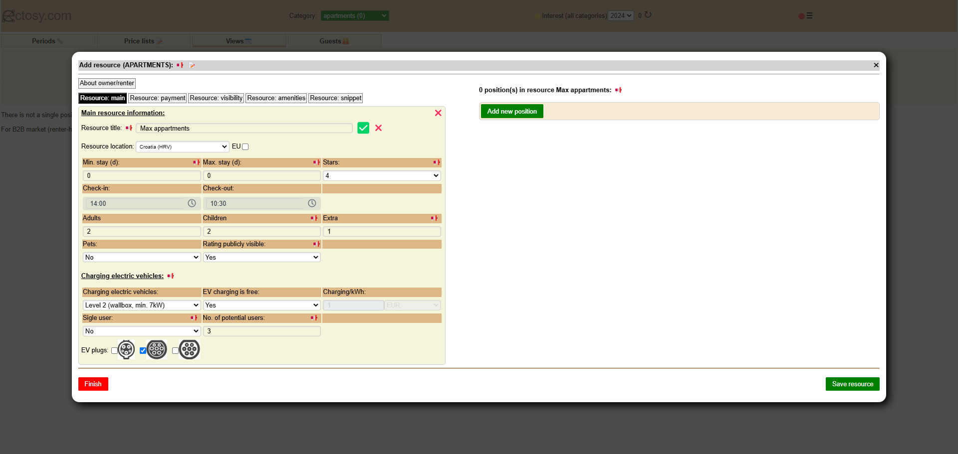A resource must have at least one position. All positions in a resource share a set of main commonalities that are defined for their resource. For example, if you rent 8 appartments of which 5 are two-rooms and 3 are one-room you will create two resources (for example named Max appartments and Mini appartments) in the 'appartments' category. In the resource Max appartments you will enter 5 positions (for example named Max appartment 1, Max appartment 2, Max appartment 3, Max appartment 4 and Max appartment 5) and in the resource Mini appartments you will enter 3 positions (for example named Mini appartment 1, Mini appartment 2 and Mini appartment 3). The difference between Max apprtments and Mini appartments will obviusly be their capacity (under Resource:main), number of sleeping rooms and their area (under Resource:amenities).