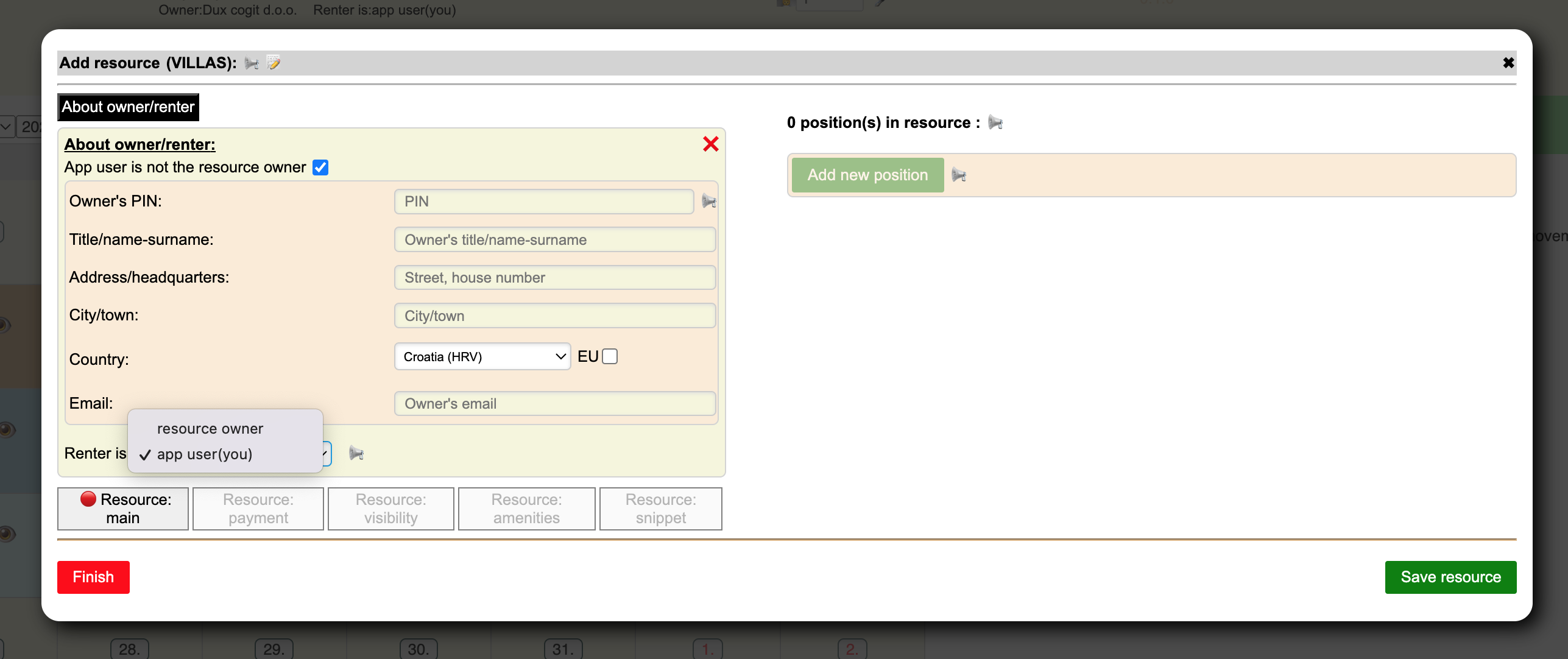 You can use ectosy.com for your property or for a property that you manage for a third person. If you check the box that you are not the resource owner you will be able to select whether the renter is you (app user) or the resource owner. You will not be able to change that entries after you save the resource for the first time.