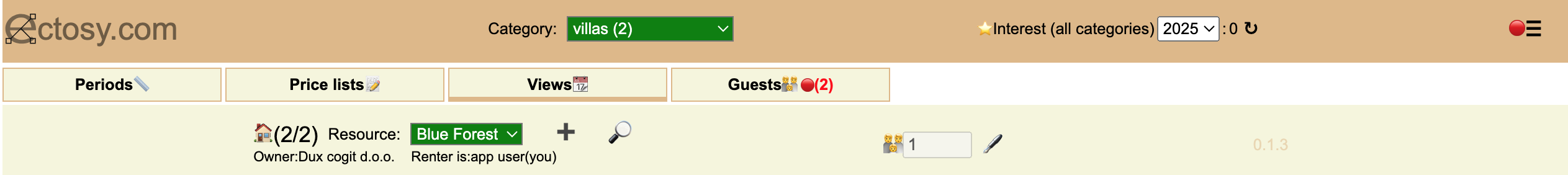 In order to enter your tourist accomodation asset select its category and click on the big plus ➕ icon in the Periods, Price lists or Views tab. To view/edit an existing asset click on the 🔎 icon.