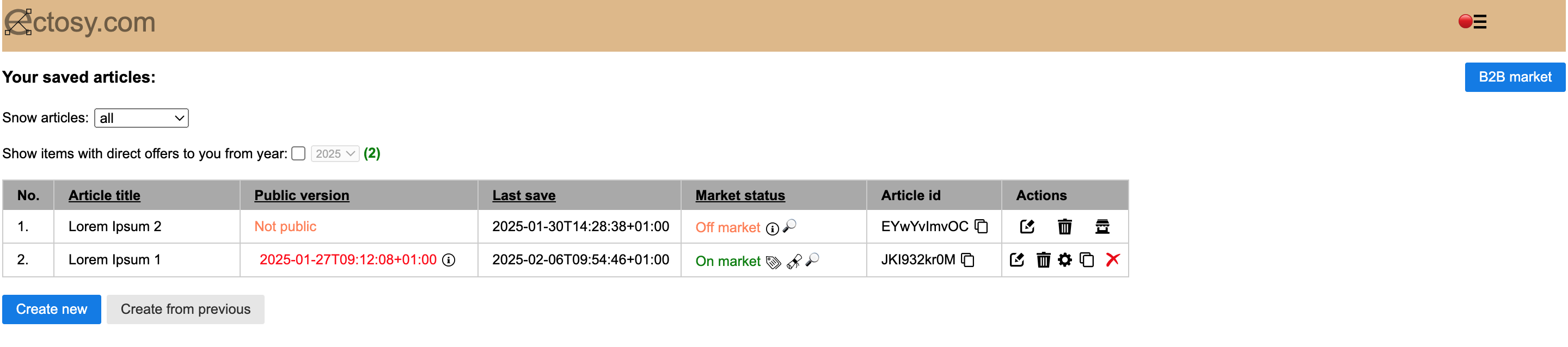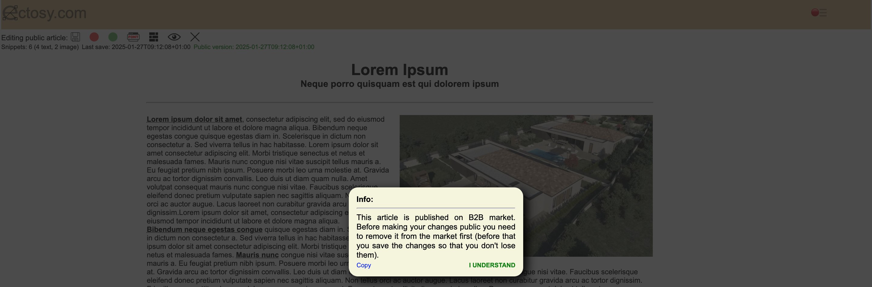 1. Article that is published on the Ectosy B2B market can be changed and saved. However, in order to make that changes public the renter has to remove it from the market.