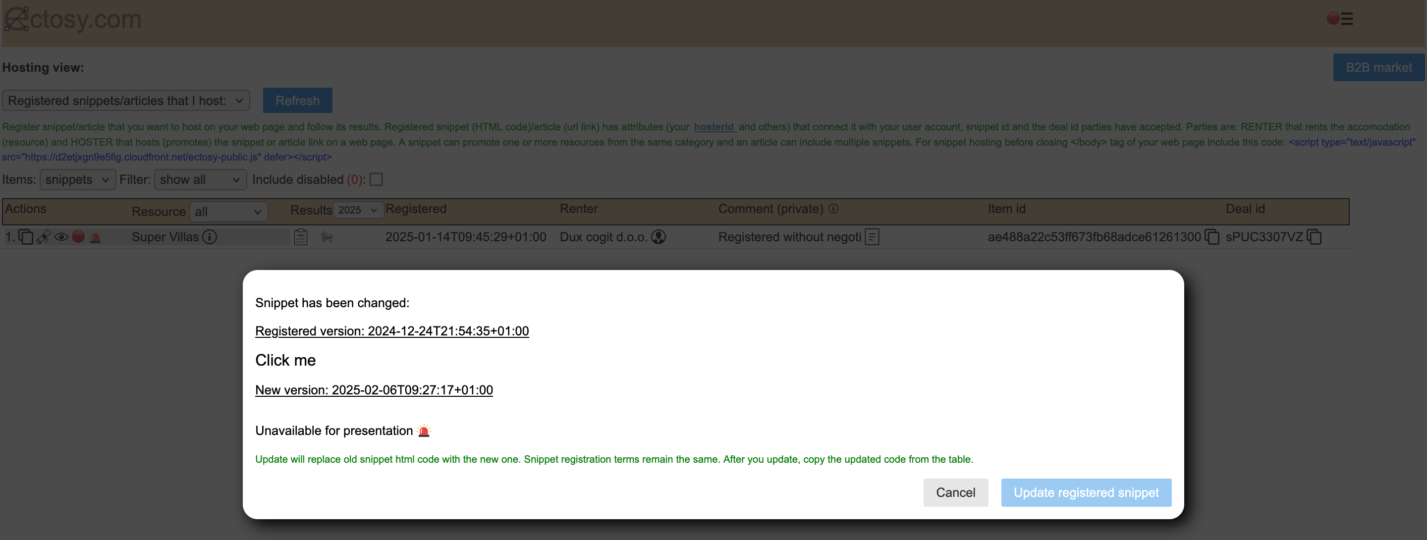 4. Unpublished registered snippet (snippet with one or more deals) can be changed. Hosters that have registered it will be notified about that with the alert icon in the Hosting view, but they will not be able to see or update their existing version until the renter publishes the new version on the B2B market. After update the new version will be available for copy (copy icon in the Actions column) in the hosters' Hosting view list.