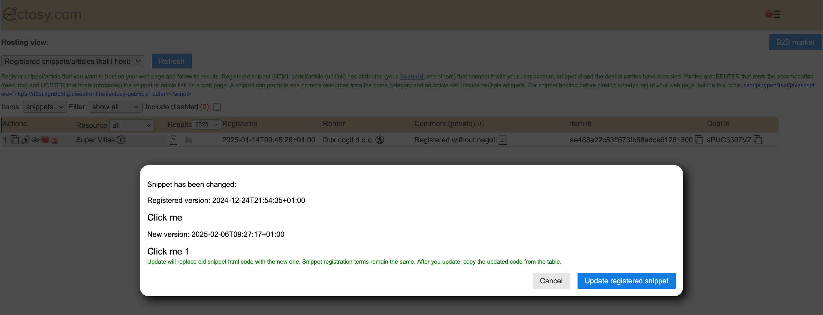 1. Snippet that is published on the Ectosy B2B market cannot be changed. In order to do that the renter has to remove it from the market.