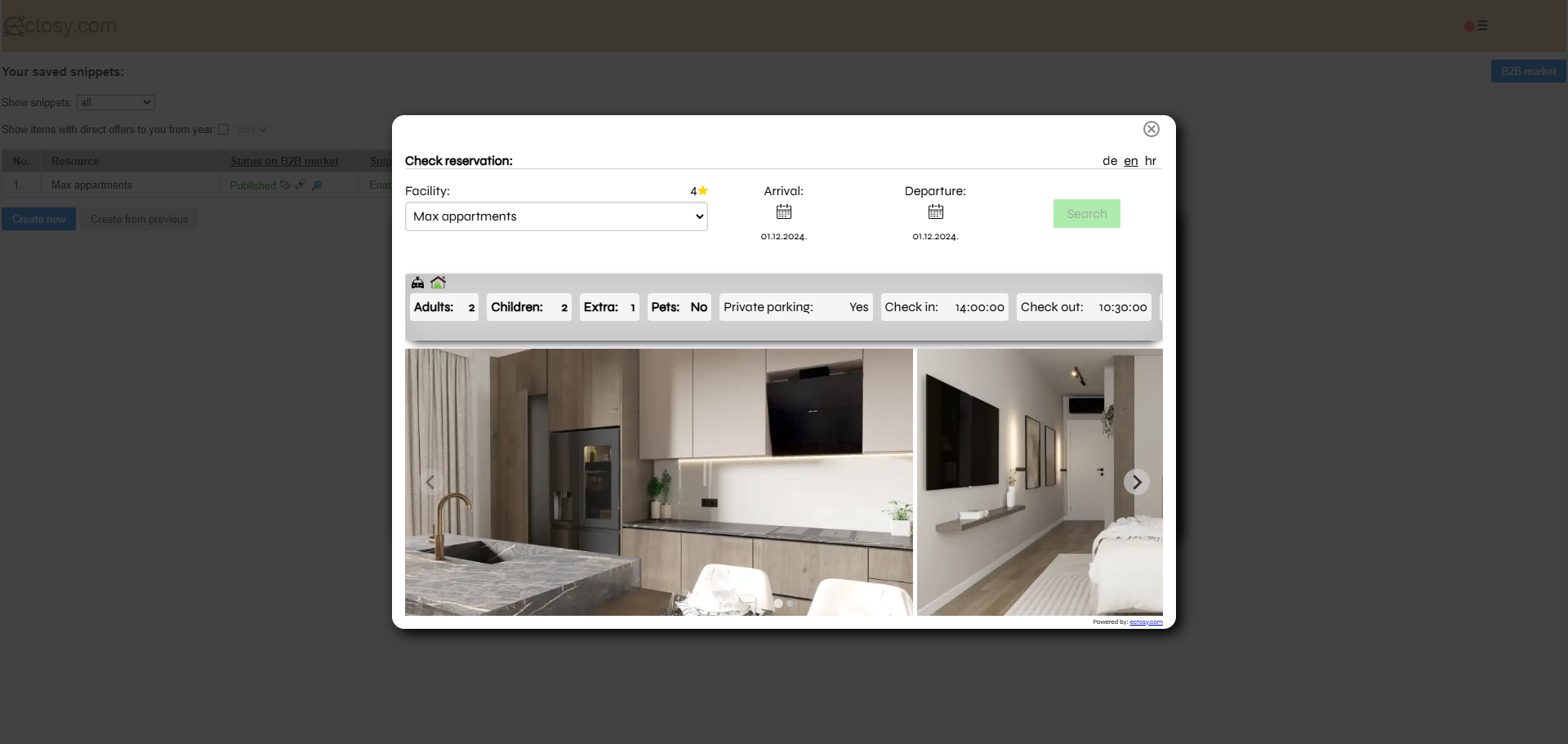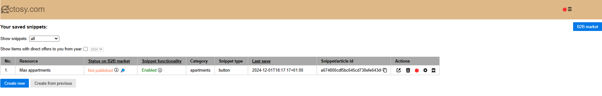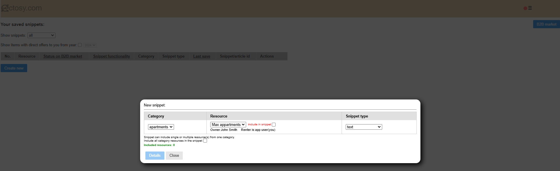 Option Creating snippets is available in the B2B dashboard. After clicking the 'Create new' button you will be presented with the basic starting data about snippet: what resource(s) it will promote and what type it will be (predefined, image, text, button, custom).