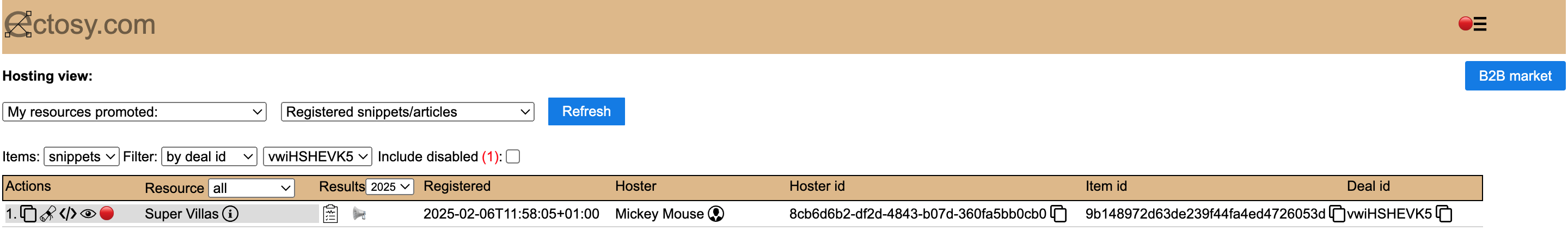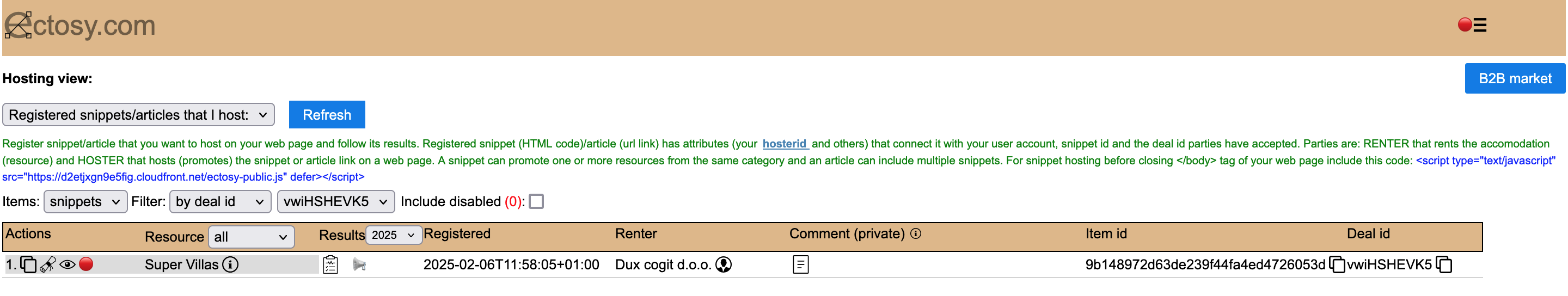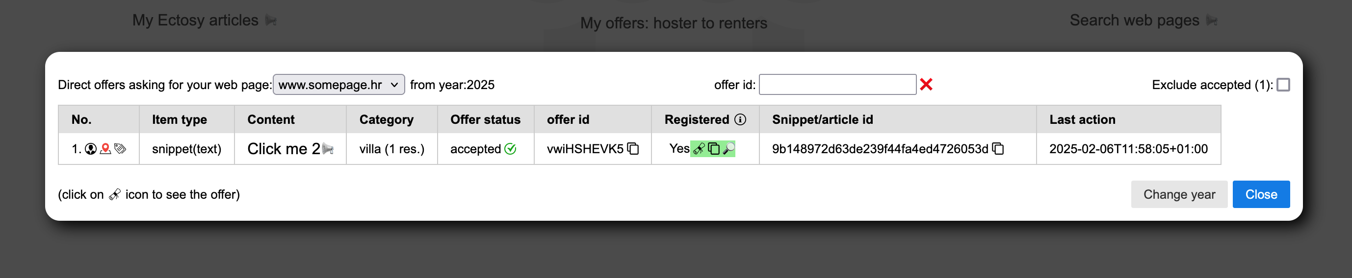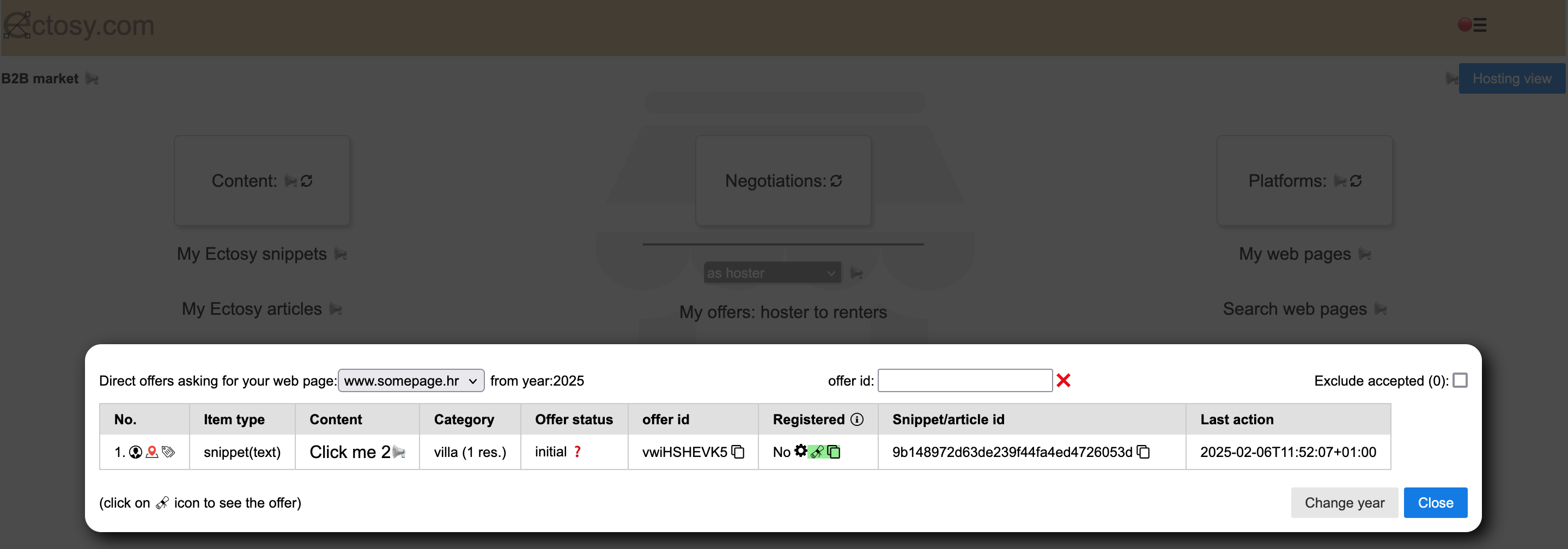 5. The offer status in both parties' dashboards becomes accepted & registered (acoomodation owner uses refresh icon in the starting B2B dashboard or reloads) and the hoster (accomodation owner) is free to use the promotional material as Ectosy snippet/article and the parties can follow the results in the Hosting view.