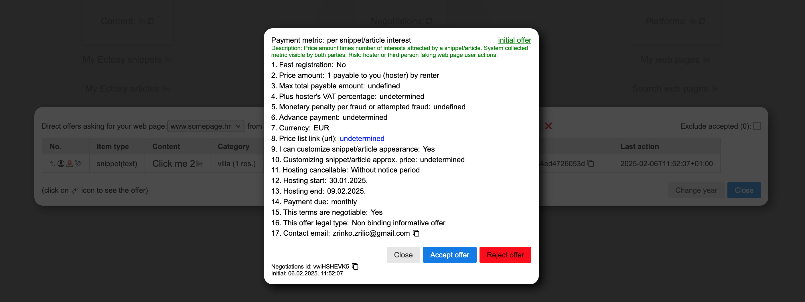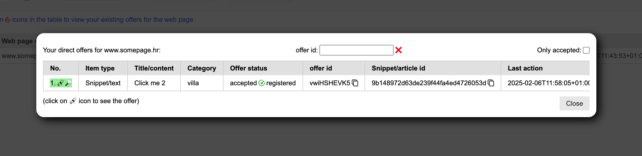 4. Web page owner sees the offer in his dashboard and accepts it (click on terms icon and then Accept offer). After that the item is automatically registered.