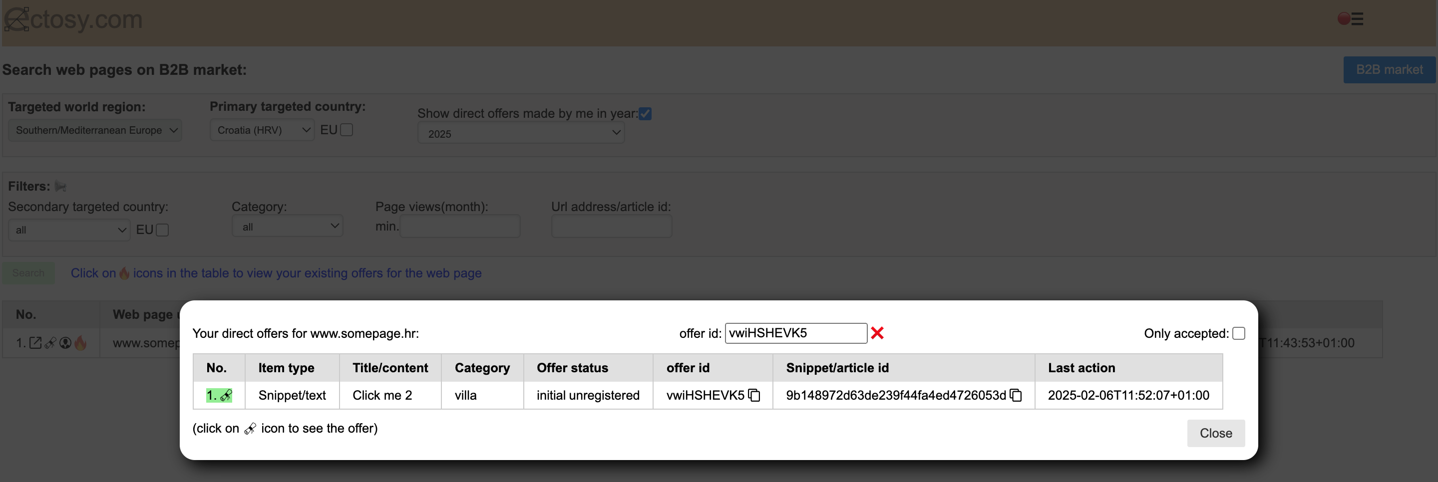 3. Accomodation owner finds the web page on the Ectosy B2B market (see B2B search web pages), checks the offer terms and, if everything is ok, proposes snippet/article to the web page owner.