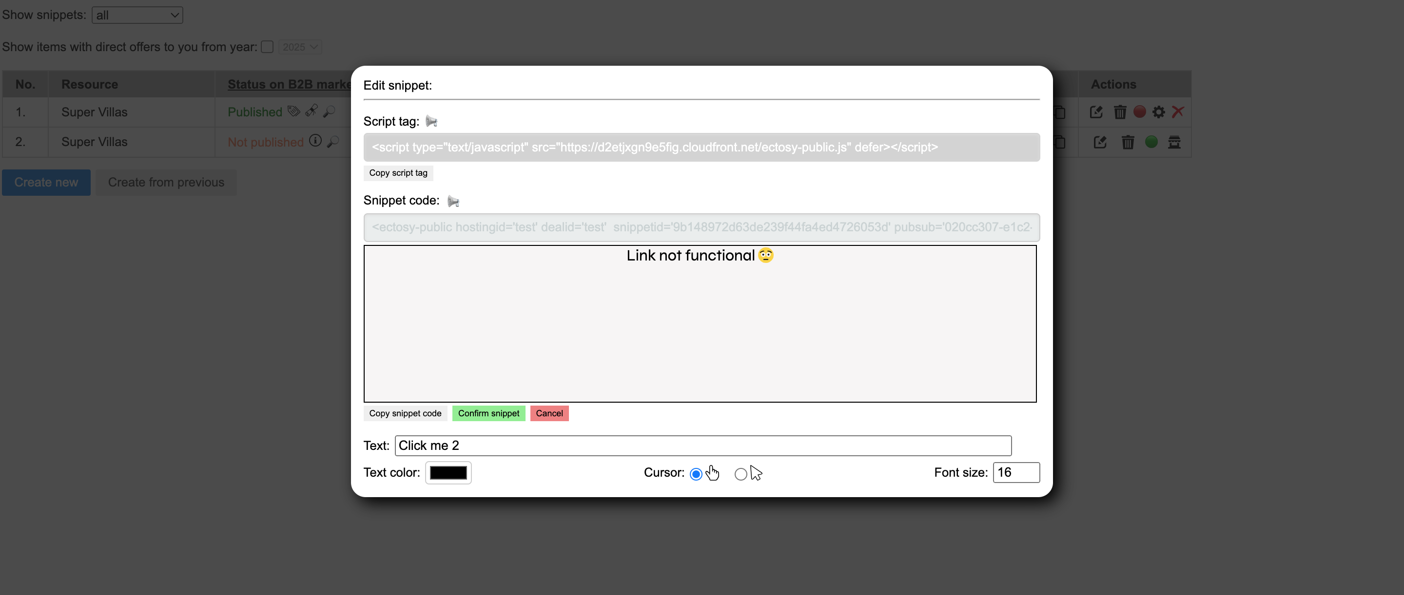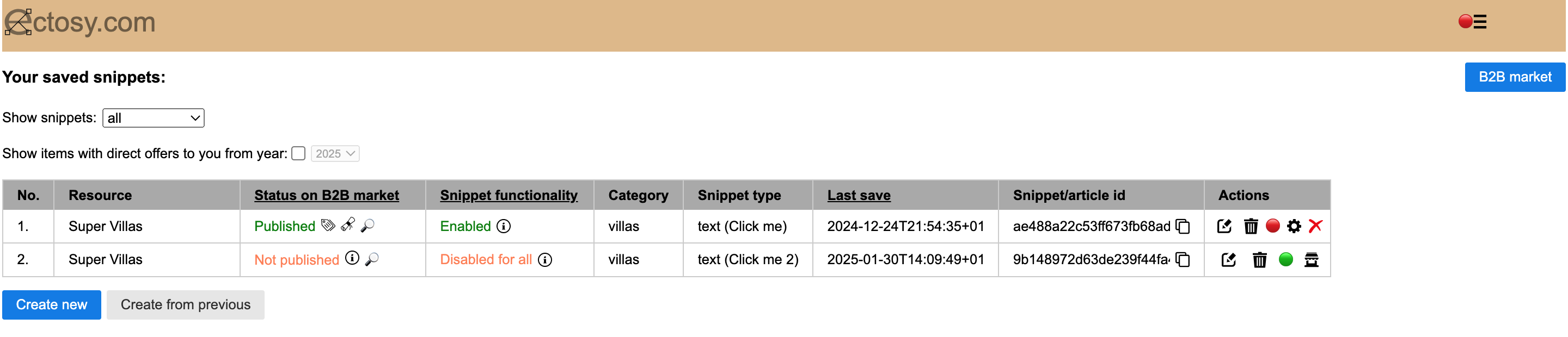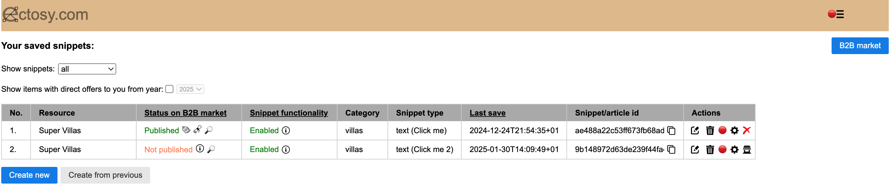 After renter creates and confirms a snippet, its functionality is by default enabled as it is shown in the snippets list. Of course, its status on B2B market is 'Not published'.