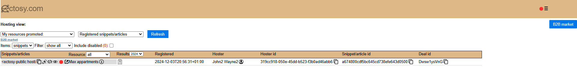 Hosters and renters can follow the results of registered snippets/articles in the application Hosting view (click on the blue Hosting view button).