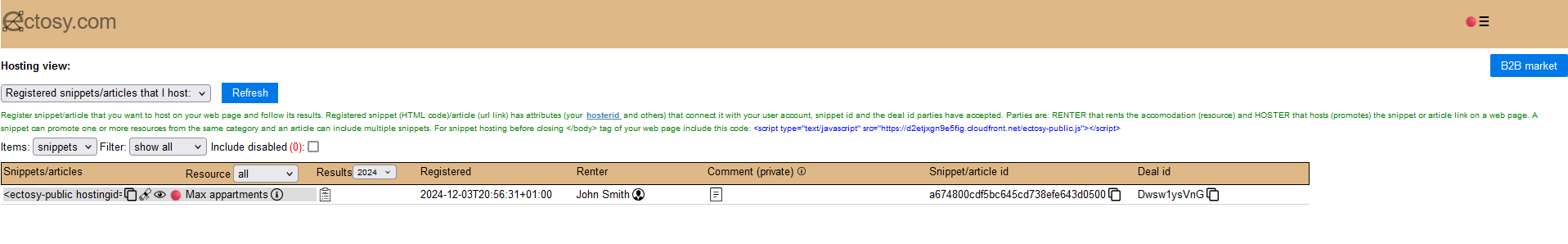 - Suboption Collected interests per web pages will show the list of all web pages (Ectosy articles included) with your snippets in them that have resulted in customers' interest. There the renter has the option to disable his snippets on a specific web page. If web page is Ectosy article disabling will prevent the presentation of whole article.