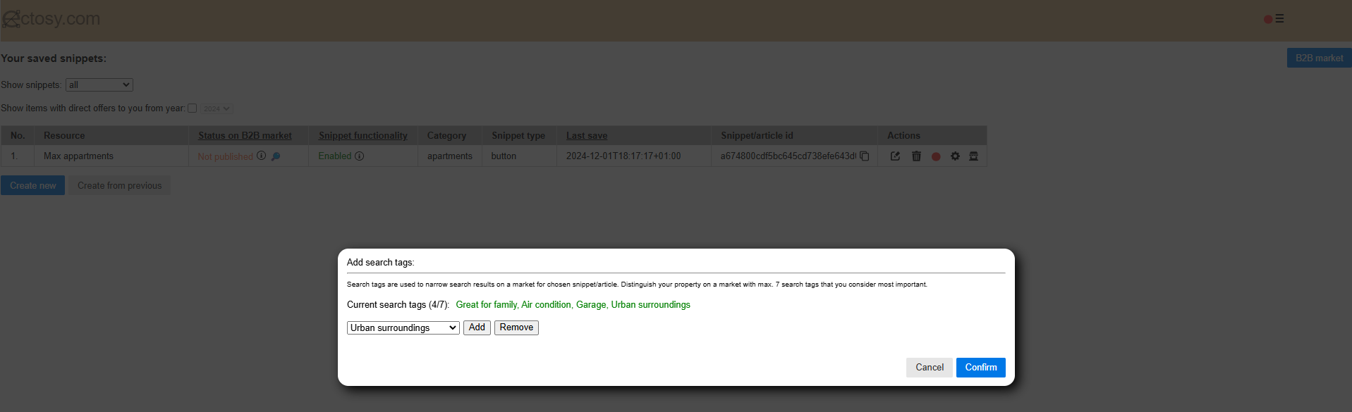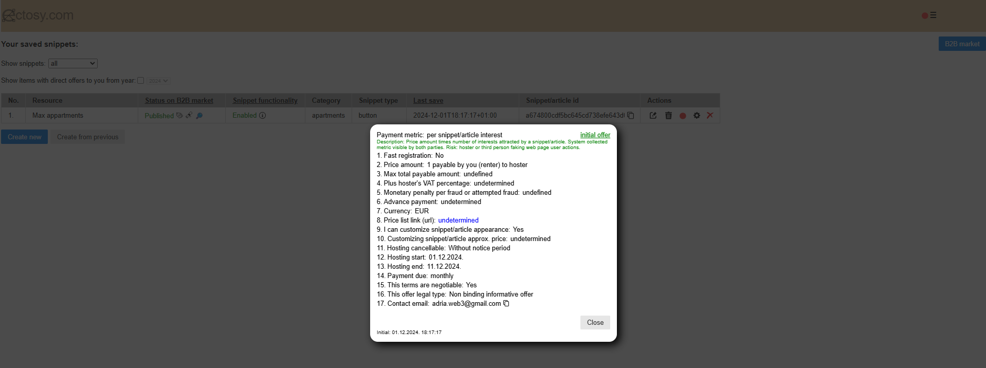 Confirm your tags, add your offer and click on the Finish button. After that your snippet and offer will be publicly accesible on the B2B market. Same procedure applies to articles and web pages. However, note that in order to publish an article on the market, it has to be public.