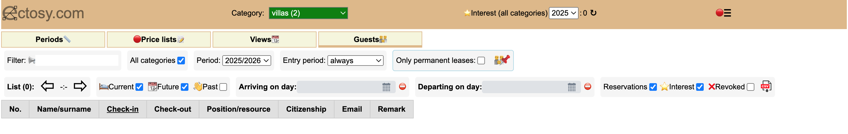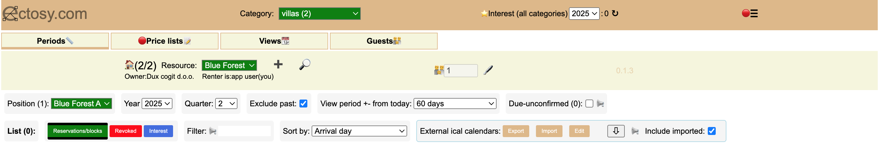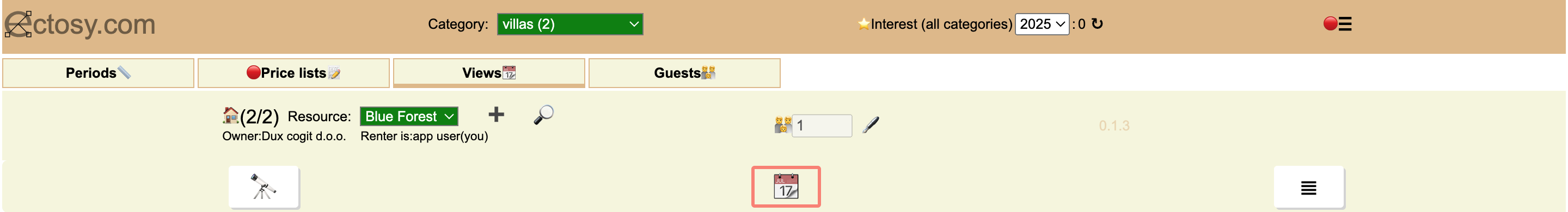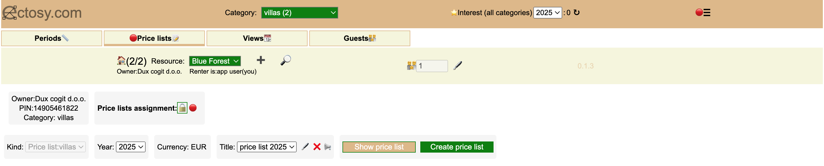 Renter dashboard consists main category selector, interest counter (per year), options and settings icon and four main tabs: Periods, Price lists, Views and Guests. Each tab has its own specific set of options: