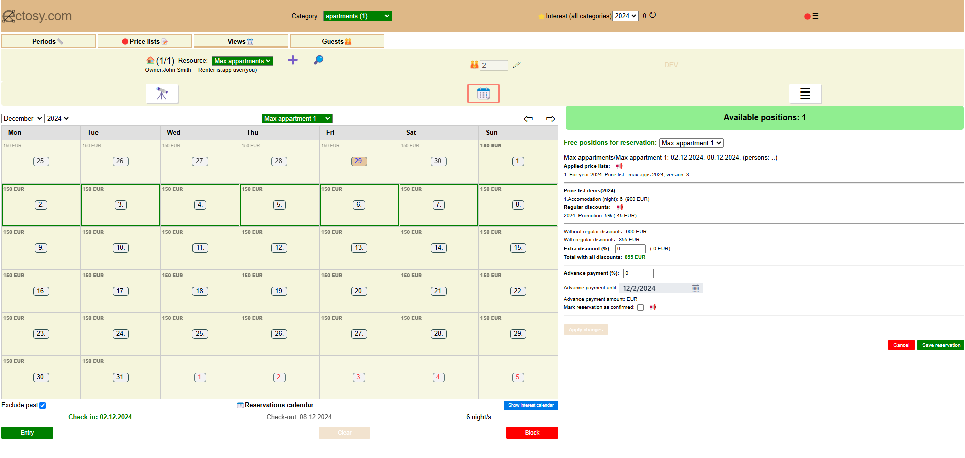 Creating reservations/interests:Renter can create reservation and interest periods directly in his dashboard, under Views tab, by Searching for free positions or by clicking on the dates in single and multiple positions calendars.