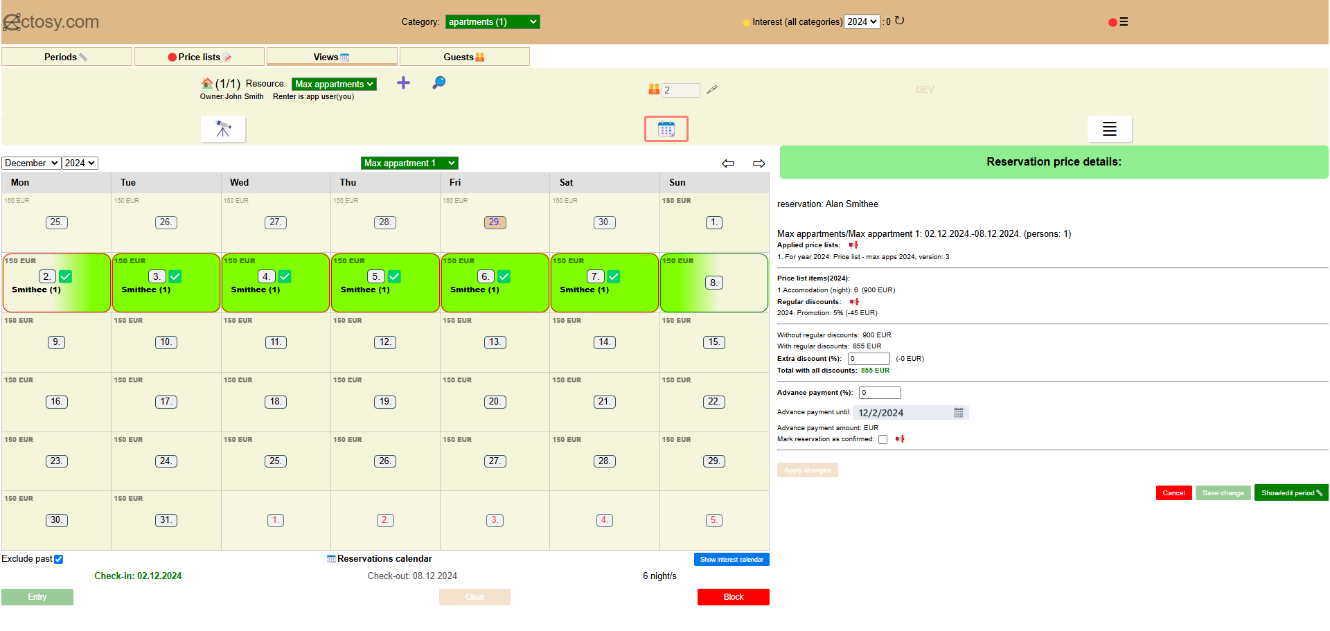 By clicking on the customer name you can see/edit his/her details and by clicking on the price you can see/edit its details. Also, here you have some additional options per period: