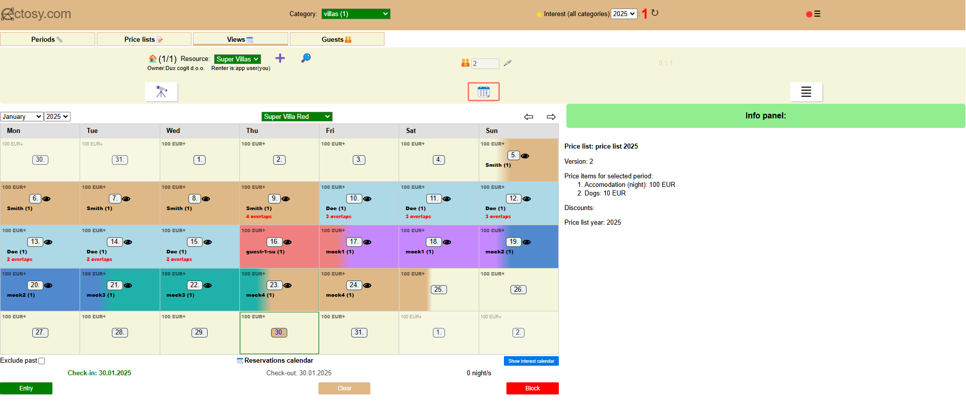 Sometimes conflicting periods can occur: public interest can overlap, reservations from external calendars can also overlap etc. In that cases overlapping periods will be visible in the calendars with red letters 'X overlaps' for each day in month.