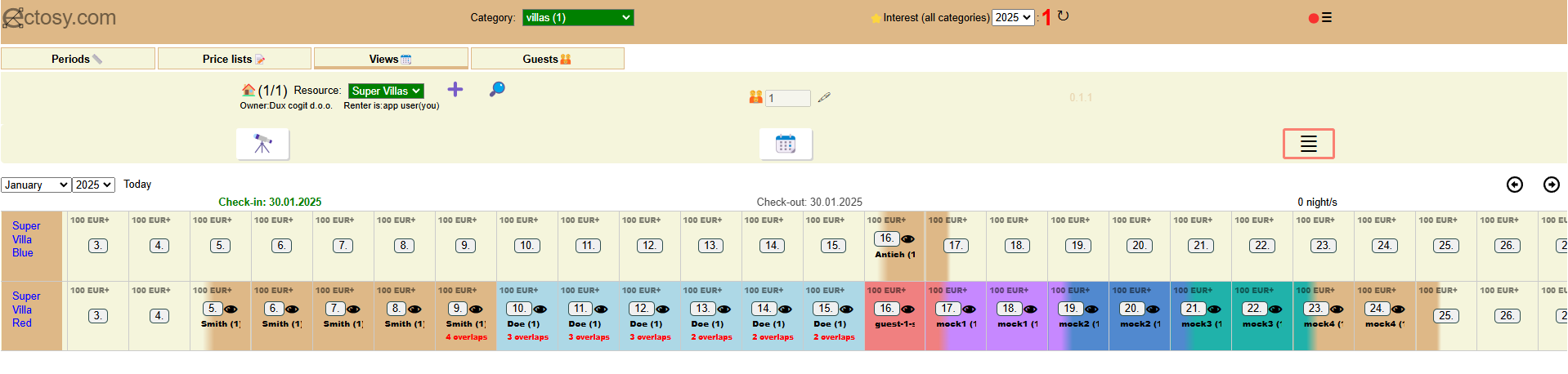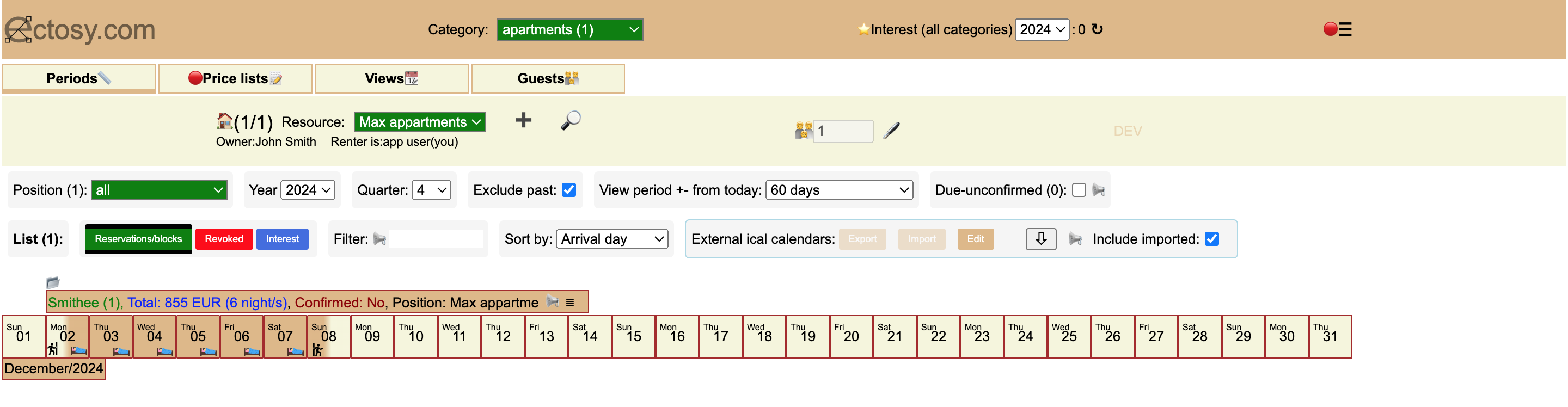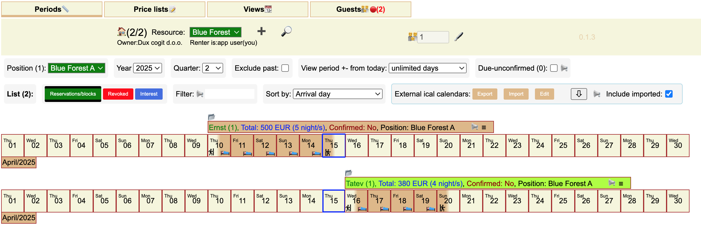 Under Periods tab you can see your reservations and interests, filtered by various options, presented as separate objects: