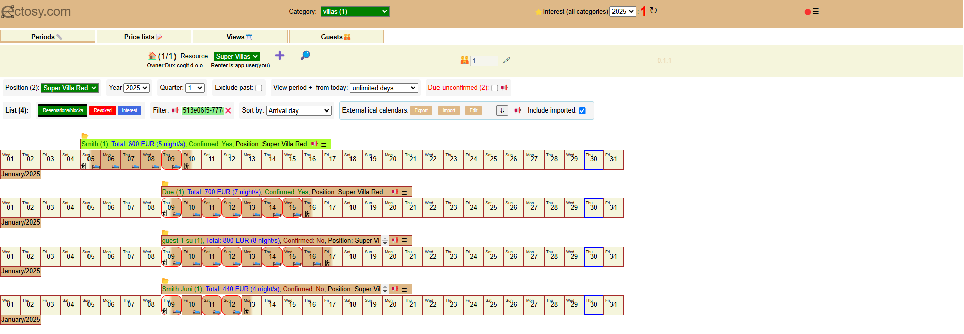 Every tourist business deals with periods (specific duration of time) that start with check-in date and end with check-out date. Mainly, there are two kinds of periods in Ectosy dashboard: periods of reservations and periods of interests. Reservations can be unconfirmed and confirmed.