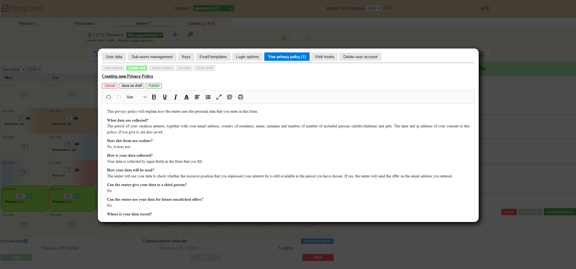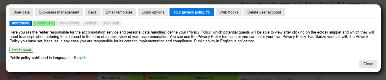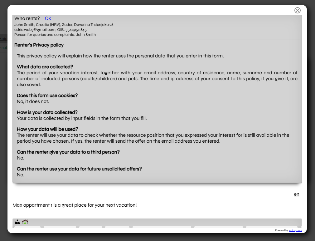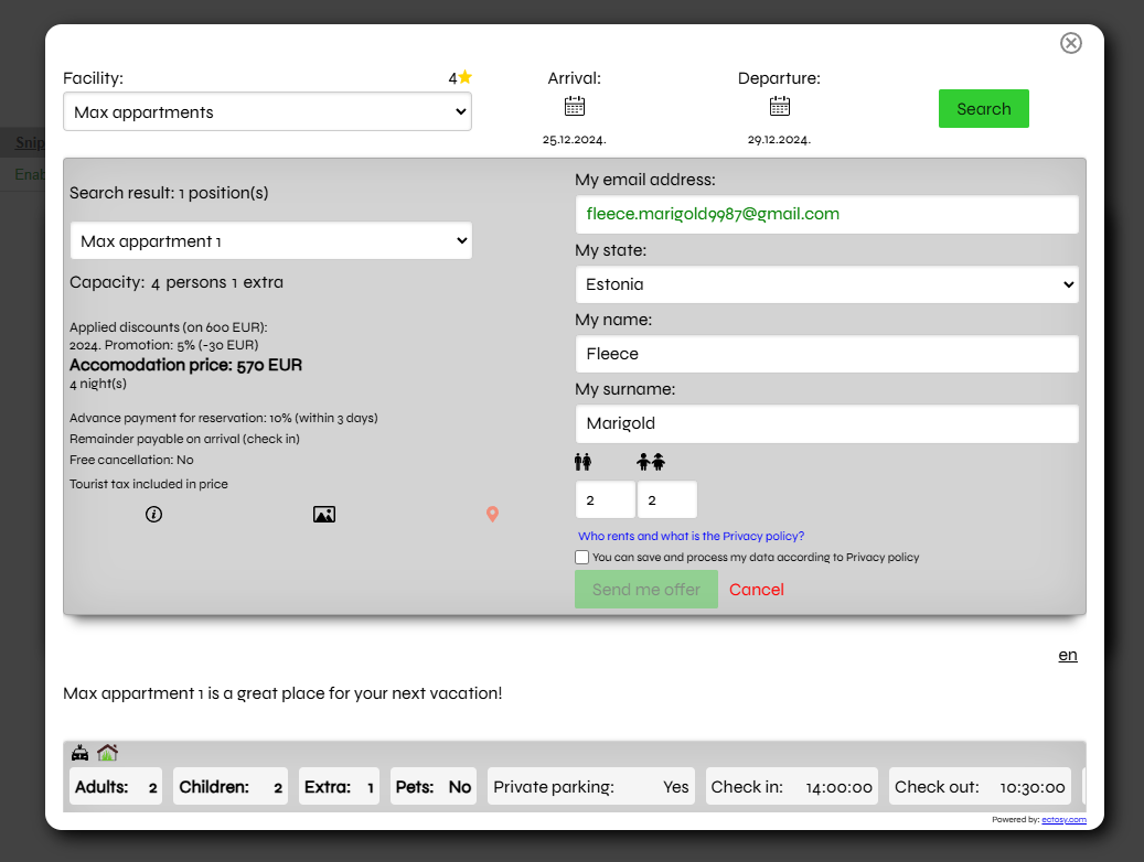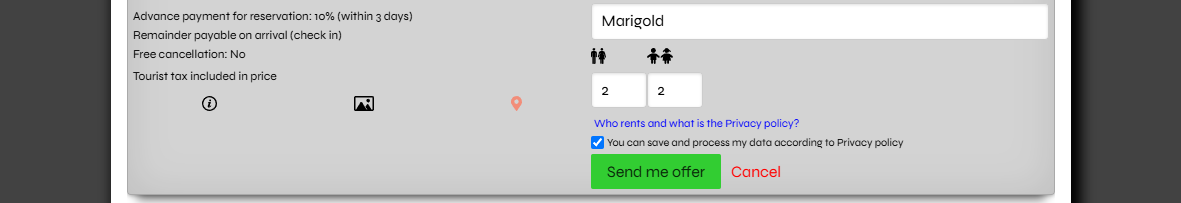 After the Public policy is published, it will be publicly visible to the potential guests who will have to confirm its acceptance before registering interests (by clicking on the Send me offer button) with their personal data (state, name, surname, email, no. of persons).