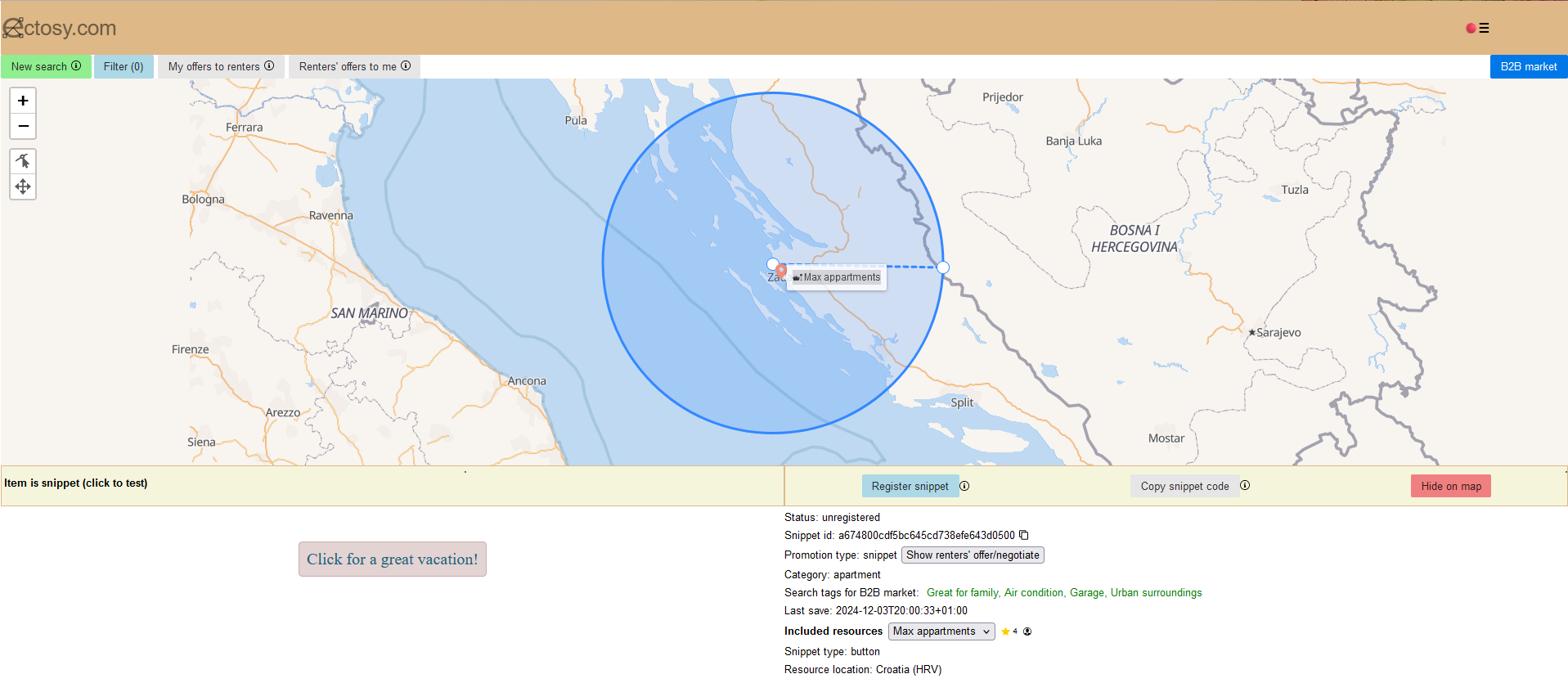 On the B2B market snippets and articles are searched by their geolocation data, on the world map. Click on any map position and place the search circle center. After that widen the search radius and click again to define it. Search results will appear in the circle. Clicking on them will result in their details visible below the map.