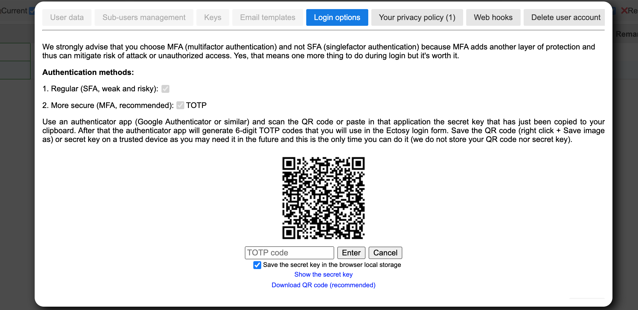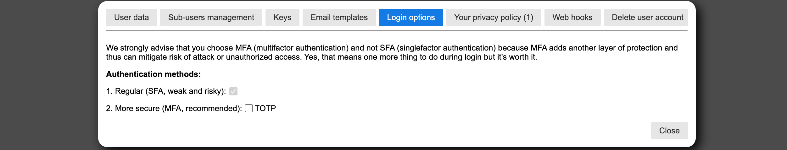5. Login options: choose between two login options: regular (username and password) or much more secure MFA (multi-factor authentication).