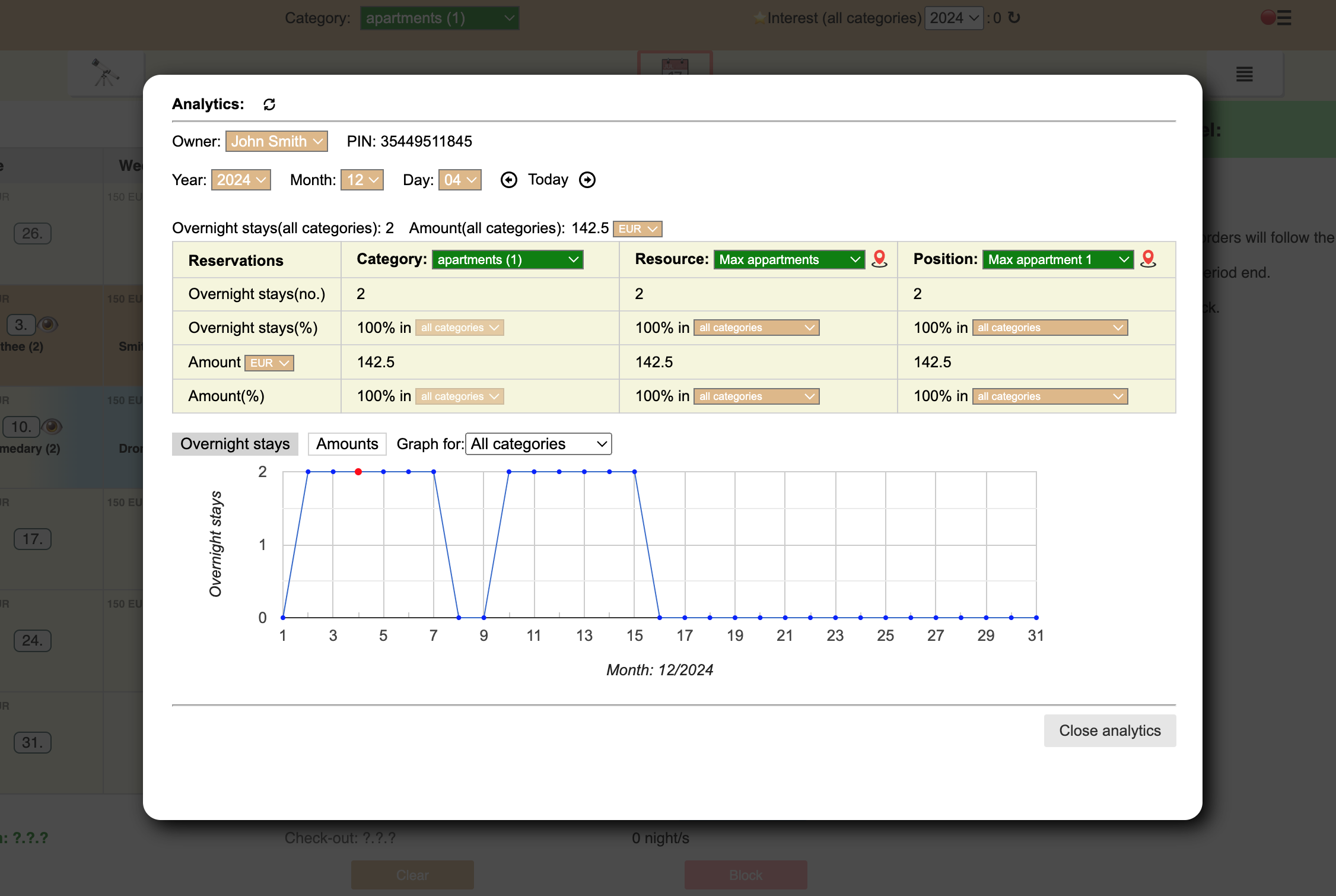 In the analytics screen the renter will be able to see various numerical and graphic reservation analytics per day, month and year, for each resource and position separately.