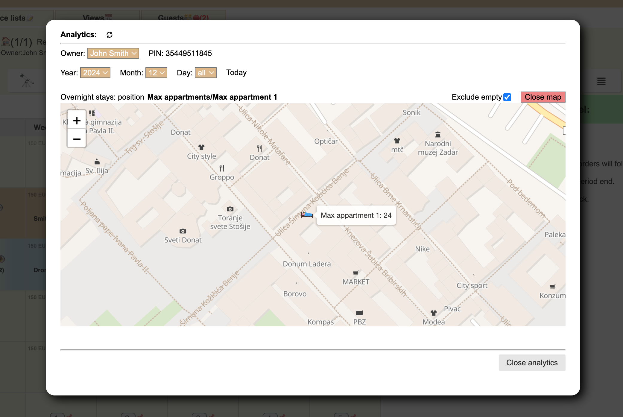 Overnight stays can be presented for each position on the map also, per day, month and year.