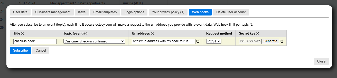 Click on the Add web hook button under Web hooks tab and subscribe your url address to an Ectosy topic (event): 1. reservation saved, 2. reservation confirmed, 3. Customer check-in confirmed and 4. Customer check-out confirmed.